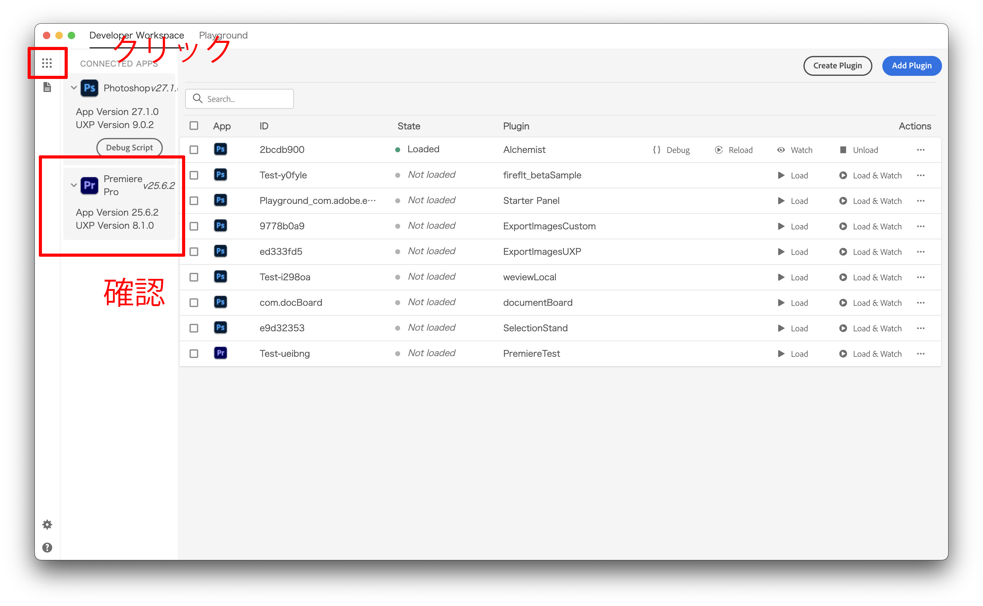 その次にUXP Developer Toolsを起動します。左上のメニューボタンをクリックしてPremiereが立ち上がっていれば開発環境ができています。